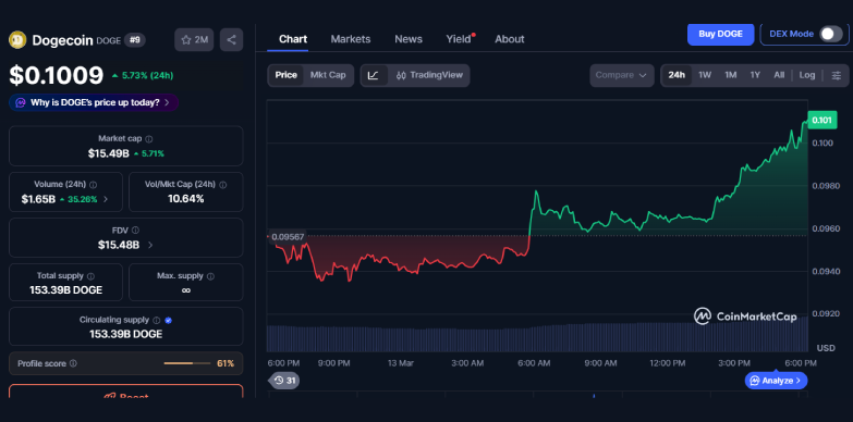 Dogecoin has jumped more than 5% today, March 13, 2026 and is hovering around the $0.1 mark. The jump can be attributed to the fact that investors are pouring money into fun, hype-driven memecoins like Dogecoin and they are shifting their focus from steadier assets.